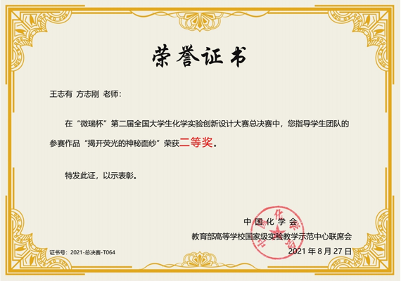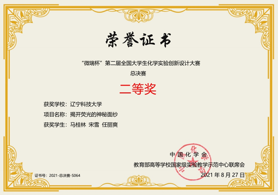 8月25日-27日,“微瑞杯”第二届全国大学生化学实验创新设计竞赛全国总决赛在青岛科技大学举行。华体会网页版化学工程学院应用化学系马桂林、宋雪、任丽爽3人团队的科普实验作品“揭开荧光的神秘面纱”(指导老师:王志有、方志刚)获二等奖。