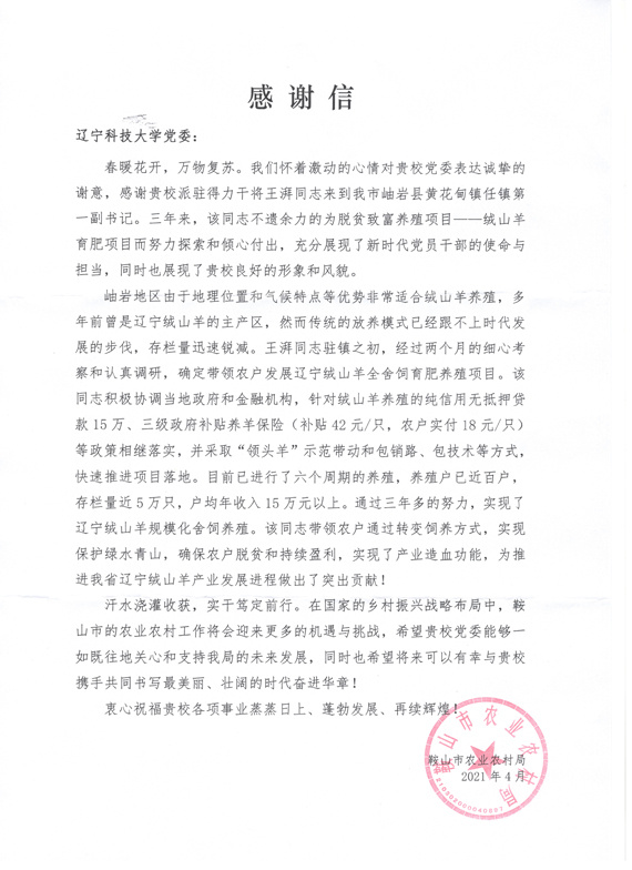 2020年11月,刚入冬的岫岩寒风凛冽,但黄花甸镇绒山羊养殖户的热情却温暖了辽宁卫视“黑土地”栏目组的记者。采访中,养殖户王大海激动地说:“我们村养羊的都是王书记带动的,再也不用出去打工了,感谢党和政府能把王书记这样为民办实事的干部派下来”。他口中的王书记就是华体会网页版党政办公室副主任王湃。2018年3月,按照学校党委的统一安排,王湃同志被选派到岫岩县黄花甸镇任第一副书记。三年来,他牢记驻村干部“抓党建、谋振兴、促脱贫”的责任与使命,积极开展驻村帮扶工作。2021年4月,鞍山市农业农村局给华体会网页版党委发来《感谢信》,对王湃同志在发展岫岩绒山羊育肥产业中的努力探索与倾心付出表示肯定,对华体会网页版党委能够派出这么多优秀干部,开展脱贫攻坚与乡村振兴工作表示感谢。