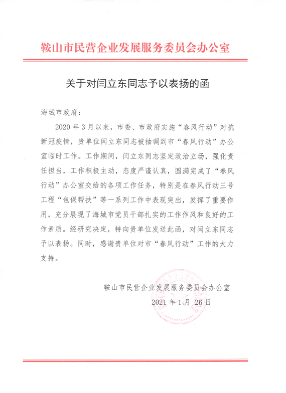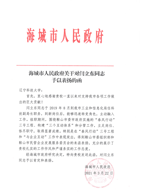 2021年1月,鞍山市民营企业发展服务委员会办公室向海城市政府送发了《关于对闫立东同志予以表扬的函》;2021年3月,海城市人民城府向华体会网页版送发了《海城市人民政府关于对闫立东同志予以表扬的函》,对闫立东同志坚定政治立场、强化责任担当,积极主动完成鞍山市的各项重点工作任务予以表扬;对科大教职工在各项工作中表现出的扎实工作作风和严谨务实的工作态度予以肯定。校党委对闫立东同志能够站在学校与地方共谋振兴发展大局的高度,敢于担当,勇于奉献,积极作为,取得了较好的工作成绩表示肯定,并号召广大选派干部向闫立东同志学习,提高站位、增强意识、珍惜机会、主动作为,在推动辽宁全面振兴、全方位振兴的广阔天地里锻炼成长。