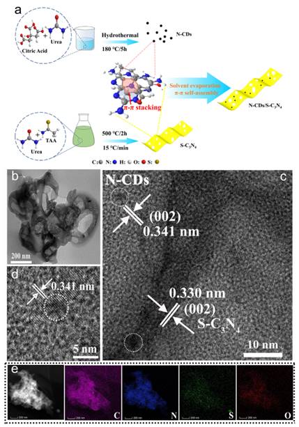 “Enhanced photocatalytic degradation andH2evolution performance of N-CDs/S-C3N4S-scheme heterojunction constructed by π-π conjugate self-assembly”为题发表在Journal of Materials Science & Technology上(IF=10.9,封面论文)。以提升光催化剂应用场景和性能为目的,通过设计并组装两个具有匹配能带结构的半导体构建异质结的角度,工作四采用简单的溶剂蒸发法通过π-π共轭相互作用在硫掺杂氮化碳半导体表面自组装氮掺杂碳点,成功制备了一种新型的0D/2D S构型异质结杂化材料。实现了光催化降解和析氢性能双向显著增强。