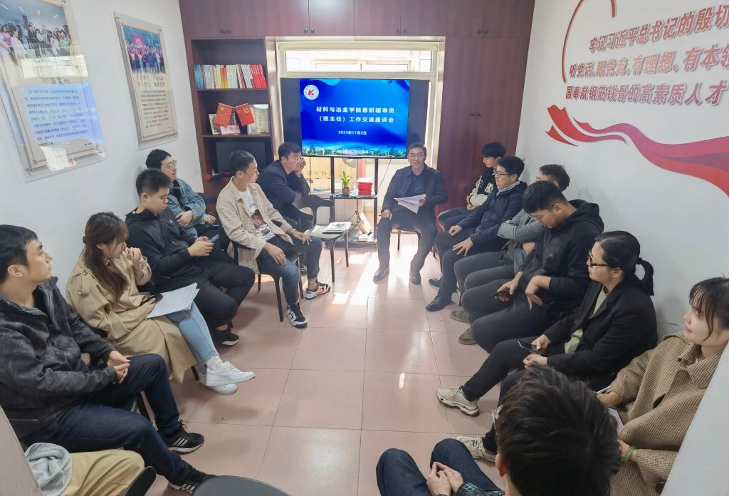 11月2日中午,材料与冶金学院新聘任班主任工作交流座谈会在龙源公寓“一站式”学生社区党团活动室召开,材料与冶金学院党委副书记兼副院长艾英华、2023级全体专职辅导员和班主任参加会议,学院学生工作办公室主任主持会议。