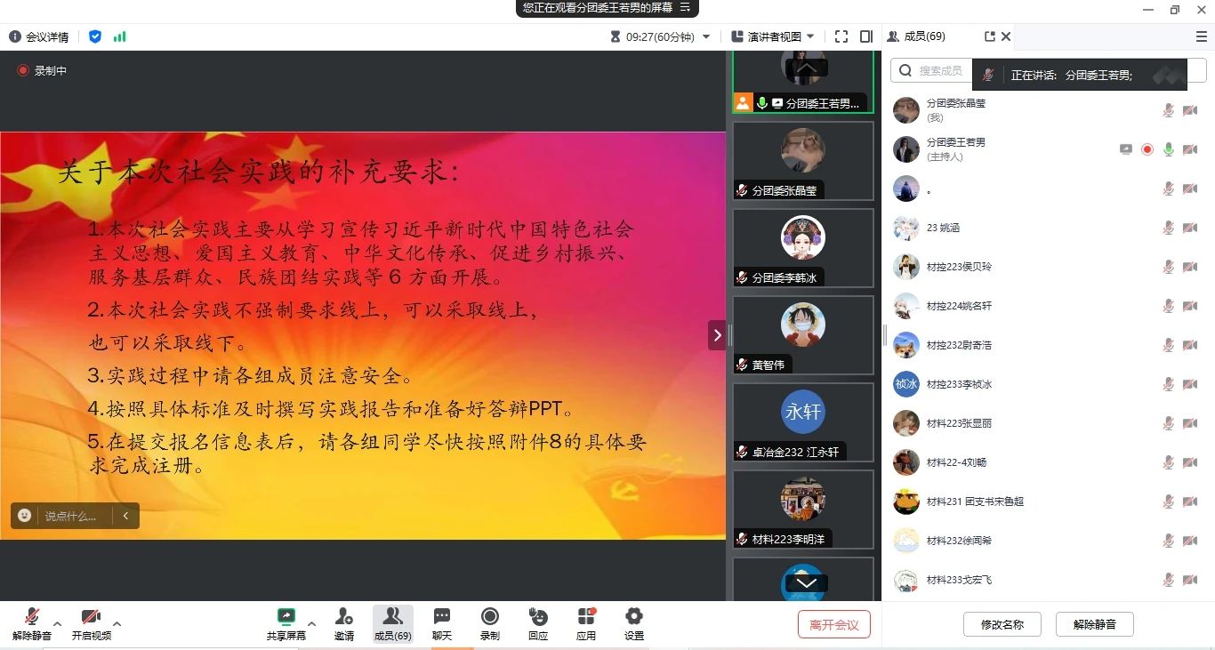 711日,材冶学院在腾讯会议召开了暑假“三下乡”社会实践活动动员大会,会议由社会实践部门工作人员主持,共计超过60名同学参与本次会议。