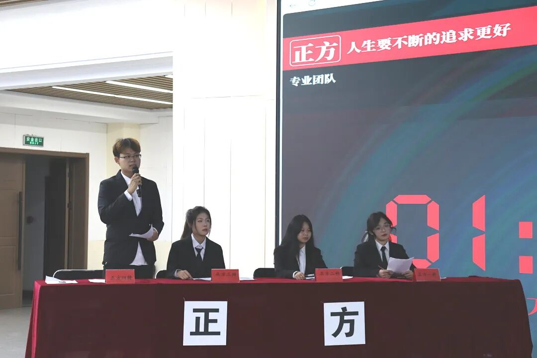 此次辩论赛围绕“人生应不断追求更好还是更应珍惜当下”这一议题展开。首先,双方一辩遵循“开宗明义,定义先行”的原则,以清晰的逻辑框架亮明核心观点,迅速抓住观众注意力。正方一辩主张“人生应不断追求更好”,将其定义为珍惜当下基础上的成长与进步,从自我实现是马斯洛需求理论必然、追求是科技创新发展动力等维度论证,强调这是积极姿态而非焦虑贪婪。反方一辩则坚持“人生更应珍惜当下”,称其为珍惜当下每分每秒的态度而非躺平,借穆夫塔、鲁迅、苏炳添等实例,论证珍惜当下对实现自我价值的重要意义。双方立论扎实有力,瞬间点燃现场热烈氛围。