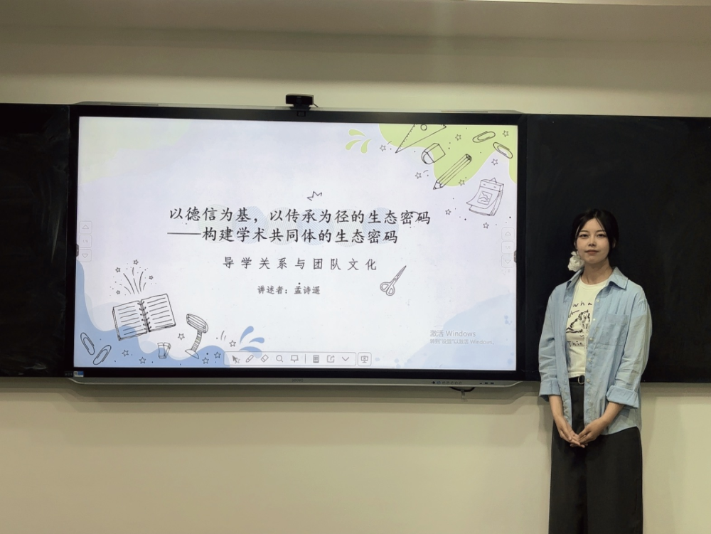 围绕“科学精神与创新思维”模块,MBA2023级孟诗遥同学围绕价值共生、机制赋能、文化浸润三个维度展开讲述。在价值共生方面,以战略解码会、知识共享日、学术承诺书等机制实现师生价值对齐;机制赋能上,通过导师赋能矩阵、学生成长档案、学术轮值主席制度等保障学术生态运转;文化浸润里,培育匠人文化、家文化、传承文化。她表达的观点是,学术生态建设需战略规划、机制设计与文化培育,将导学关系升华为价值共同体,把团队文化锻造成精神图腾,以构建可持续发展的学术生态。研2023级王煦同学分享了关于构建良性学术生态的思考与实践经验。她系统梳理了当前学术环境中存在的典型问题,并针对上述问题,提出三方面解决路径:一是推动导学关系从“权威指导”转向“双向赋能”,强调导师需以严谨治学树立底线意识,学生应主动担责、反哺团队;二是通过“研究全生命周期管理”“学术伦理委员会”等制度筑牢规范防火墙;三是借“失败案例库”等形式激活团队内生动力。她呼吁学术界以制度为基、文化为魂,摒弃形式化协作,坚守学术纯粹性,方能构