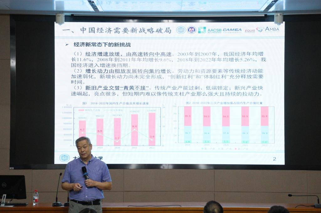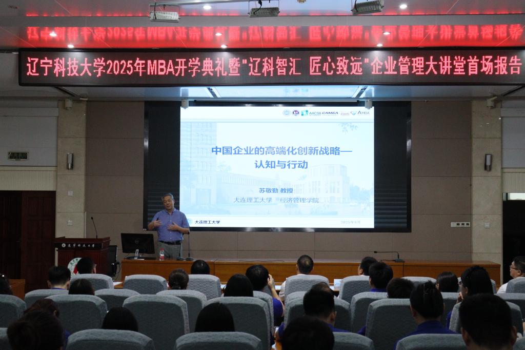 2025年8月30日,华体会网页版工商管理学院迎来了一场思想盛宴——MBA2025级开学典礼暨“辽科智汇·匠心致远”企业管理大讲堂正式启动。首场报告特邀国家级领军人才、大连理工大学苏敬勤教授作题为《中国企业的高端化战略—从认知到行动》的专题演讲。讲座由工商管理学院院长金玉然教授主持,2025级全体MBA学员及部分教师参与本次论坛。
