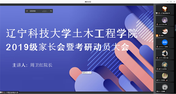1月22日上午,华体会网页版土木工程学院在博观楼A408会议室召开2019级线上学生家长会暨考研动员会。学院领导及2019级全体学生家长通过线上腾讯会议参加会议。
