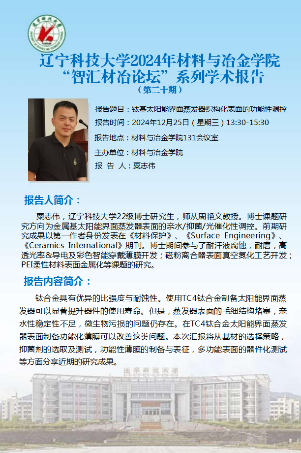 学术预告:钛基太阳能界面蒸发器织构化表面的功能性调控