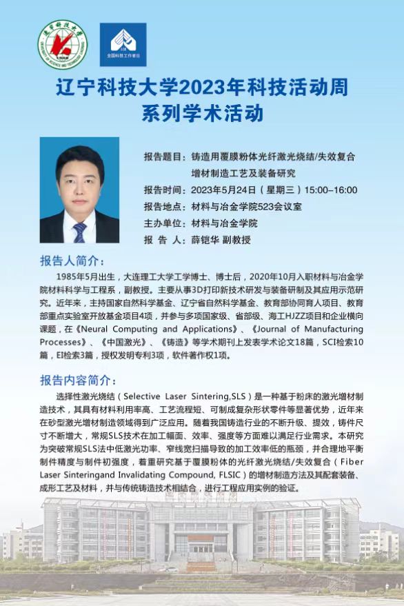 【科技活动周学术预告】铸造用覆膜粉体光纤激光烧结/失效复合增材制造工艺及装备研究