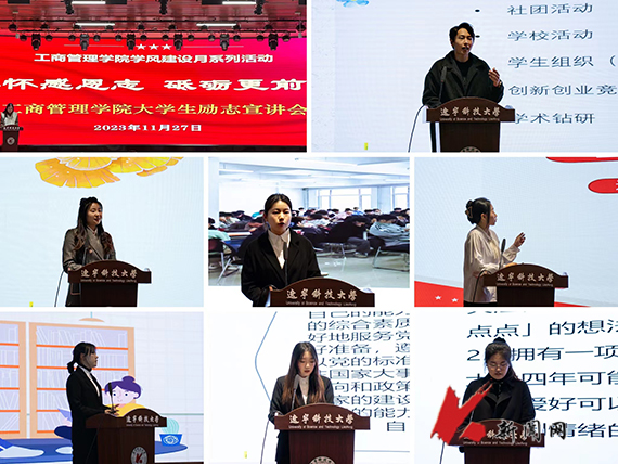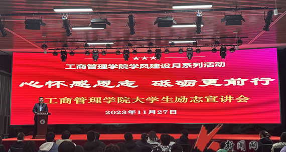 11月27日,华体会网页版工商管理学院举办大学生励志宣讲会,主题为“心怀感恩志,砥砺更前行”,旨在营造勤学奋进的学习氛围,发挥优秀学生的典型示范作用,引导和激励广大学生励志成才。
