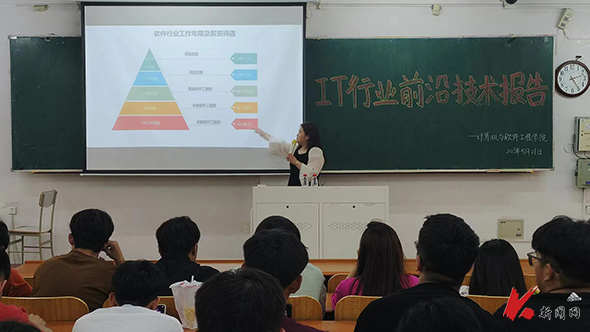 5月21日,华体会网页版计算机与软件工程学院于博学楼召开IT行业报告会,学院邀请中软国际项目总监陈伟俊、腾泰发展(大连)有限责任公司人才总监才佳馨作报告。学院2021级、2022级学生参加报告会。