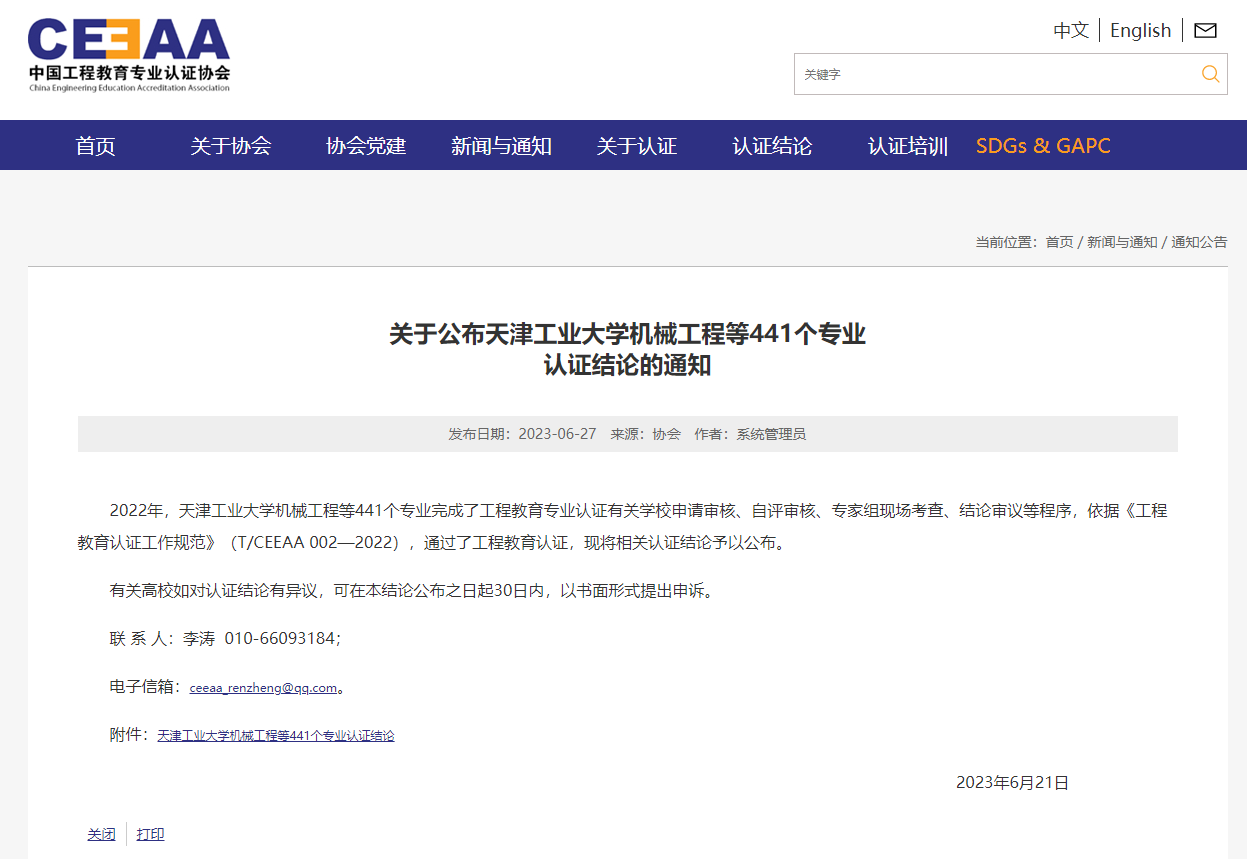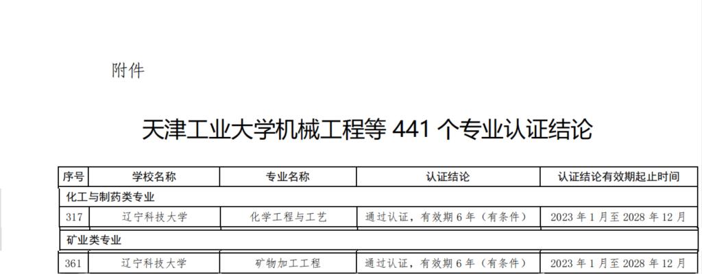 6月21日,中国工程教育专业认证协会官方网站发布了《关于公布天津工业大学机械工程等441个专业认证结论的通知》,华体会网页版化学工程学院化学工程与工艺专业、矿业工程学院矿物加工工程专业通过认证,有效期6年(2023年1月至2028年12月),专业将纳入《华盛顿协议》互认名单。