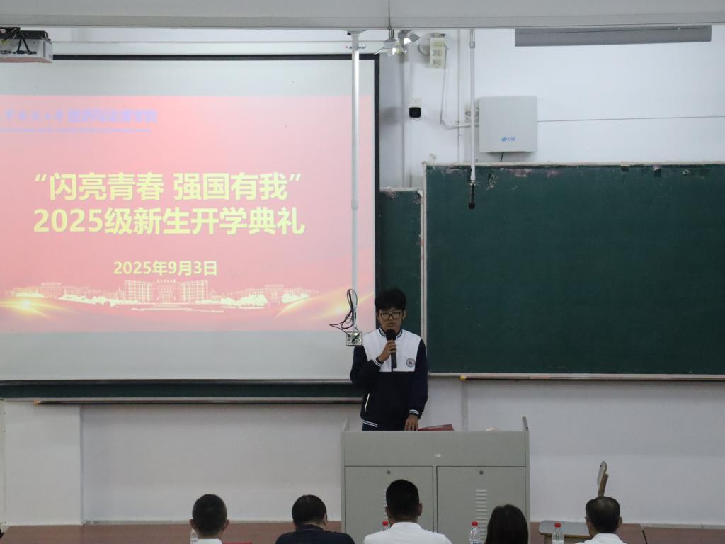 院长郭浩淼在致辞中对新生寄予期望,强调大学是知识积累与自我成长的关键阶段,希望同学们脚踏实地夯实专业基础、提升综合素养,同时心怀高远、以理想为帆,在追求卓越中实现个人价值与时代使命同频共振;教师代表王英凯结合教学经验为新生指引方向,鼓励他们珍惜大学时光,既要深耕专业知识、构建系统知识体系,也要参与学科竞赛与社会实践,在实践中锤炼能力、拓宽视野,让大学生活充实有意义;学院学生会执行主席赵心豪作为在校生代表,分享学习成长感悟,勉励学弟学妹以学习为首要任务,明确目标、找准方向,以乐观心态直面挑战、把握机遇,在磨砺中成长收获;法学25-1班孟思同作为新生代表发言,表达了初入校园的激动与期待,承诺将树立学习目标,尊重师长、团结同学,努力成长为“四有”新时代大学生;国贸25-1班李欢阅母亲作为家长代表向学院致谢并寄语新生,希望他们在大学新起点扬起梦想风帆,以勤勉笃行深耕学业、积极进取探索未知,不辜负父母期盼与师长教诲;最后,学院党委书记赵智博作总结讲话,指出新时代为青年提供广阔舞台,希望同学们筑牢学识根基、练就过硬本领,保持锐意进取精神,主动适应时代需求,在大学征程中扬帆远航。