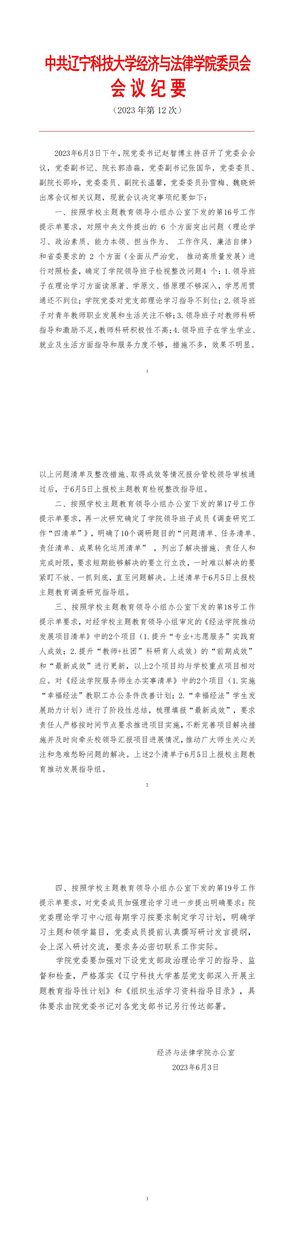 中共华体会网页版经济与法律学院委员会会议纪要(2023年第12次)