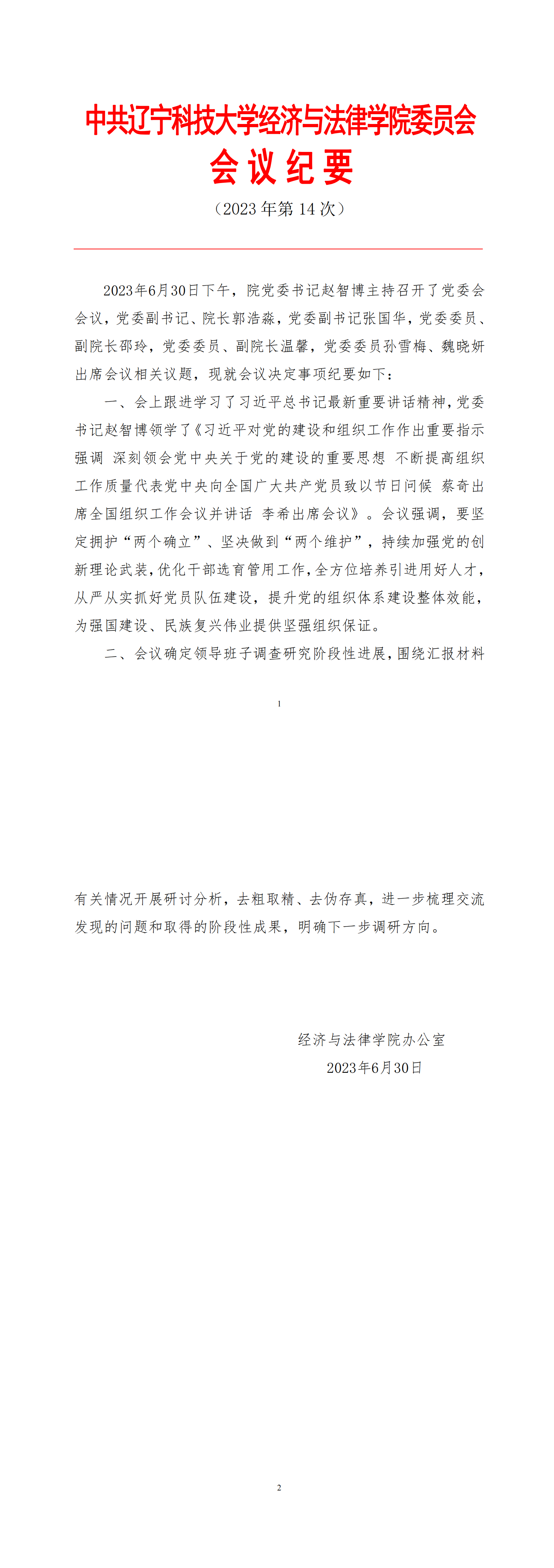 中共华体会网页版经济与法律学院委员会会议纪要(2023年第14次)