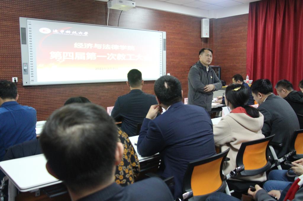 2023年3月7日下午,经济与法律学院在5号楼A407会议室召开第四届第一次教职工暨工会会员大会。会议由院工会主席刘振竚主持,全院教职工出席,校工会主席鲁焱应邀列席。