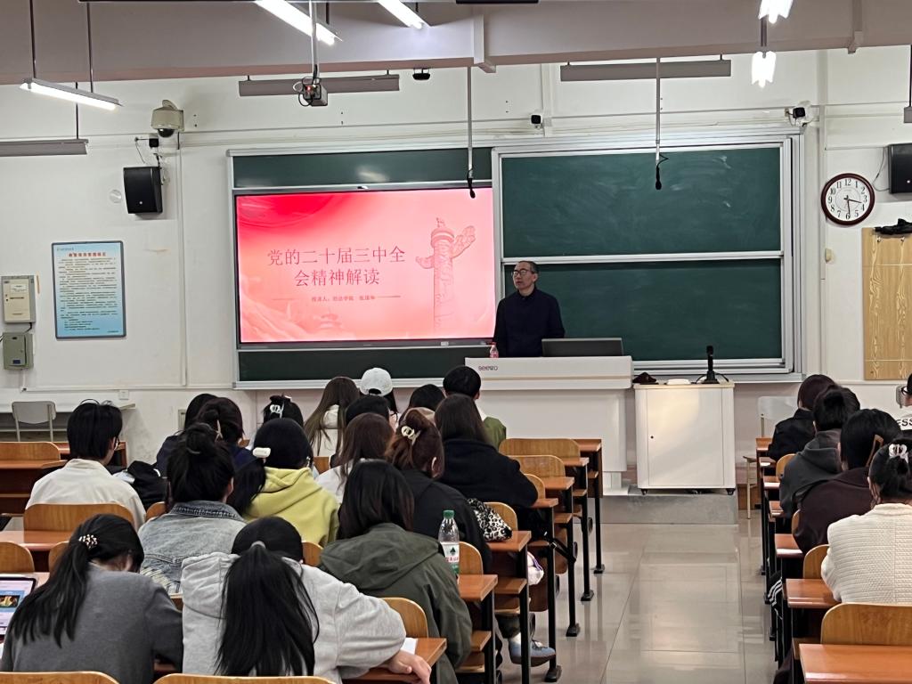 辅导员以“学习党的二十届三中全会精神”为主题,传达党的先进思想,先进理论。辅导员指出党的二十届三中全会的核心内容,涵盖政治、经济、文化、社会、生态文明等各个方面,每一项内容都是对我国社会主义现代化建设规律的深化认识,都是对习近平新时代中国特色社会主义思想的丰富发展。全会进一步强调了党的领导核心地位,不断完善党的领导制度体系,这为中国式现代化提供了坚实的政治保障。同时,会议着重指出要推动高质量发展,加快构建新发展格局,让我国经济发展更具活力、更具竞争力。最后,辅导员表示,希望同学们不断提高自己的理论素养,用科学理论武装头脑,指导实践,以更加坚定的信念投身到全面建设社会主义现代化国家的伟大实践中。
