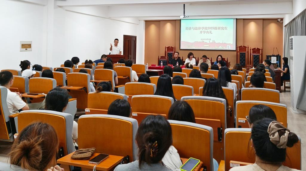 9月5日上午,经法学院于博识楼A402举行2025级硕士研究生开学典礼。典礼由学院党委书记赵智博主持,学院领导班子全体成员、辅导员和部分研究生导师代表及2025级57名研究生齐聚一堂,共同见证这一承载期待与梦想的重要时刻。