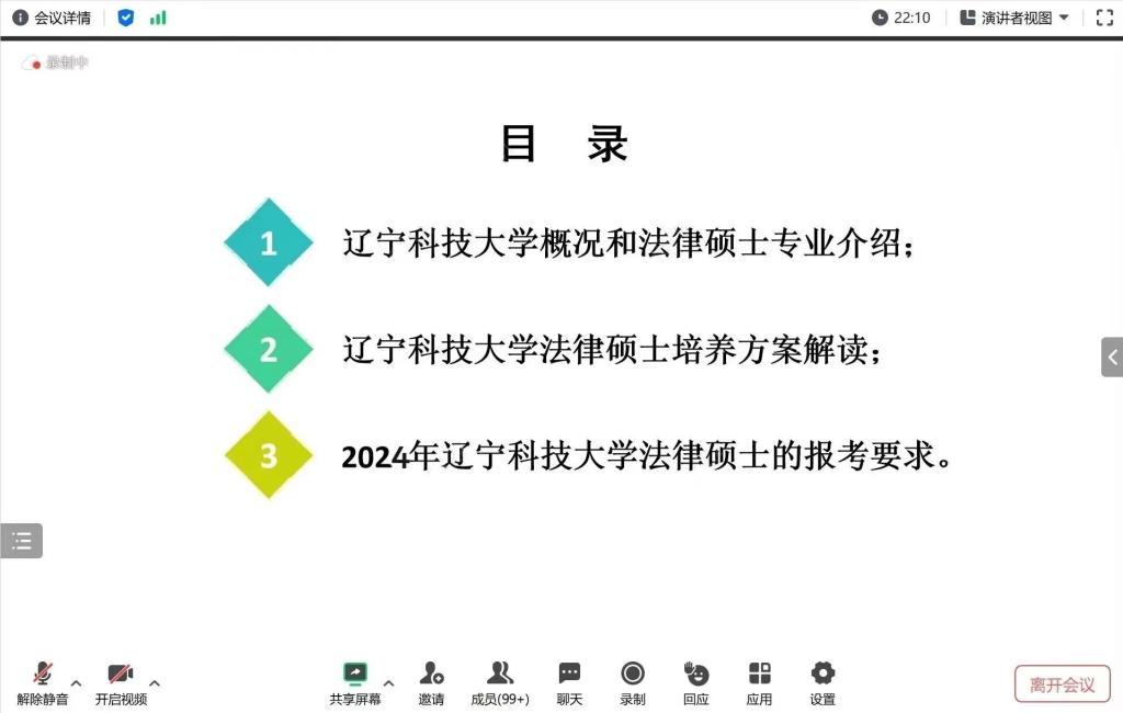 9月25日,经法学院召开华体会网页版法律硕士线上招生宣讲会。会议由经法学院法硕中心主任武婷婷老师主持,经法学院院长郭浩淼教授主讲,法硕导师及意向报考华体会网页版法律硕士的学生将近200人参加了会议。