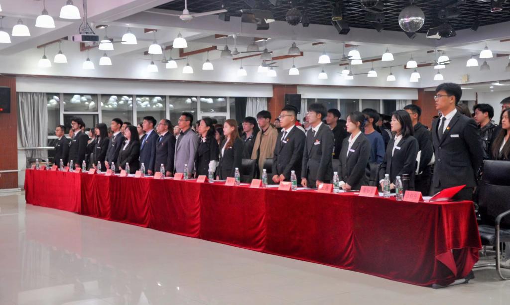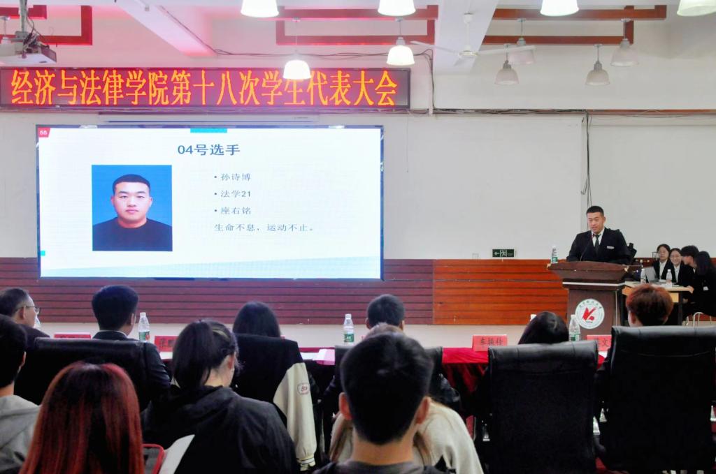 10月12日晚,经法学院于明德楼大学生活动中心召开第十八次学生代表大会。本次大会由经法学院第十七届学生会主席团成员兼办公室负责人刘爱琳主持,学院党委书记赵智博、党委副书记张国华、学办主任齐艳萍、团委副书记张鹏飞、学院团学骨干以及来自21个班级的150余名学生代表参加。本次大会共有11名同学参与部门负责人竞选,49名同学参与工作人员竞选。