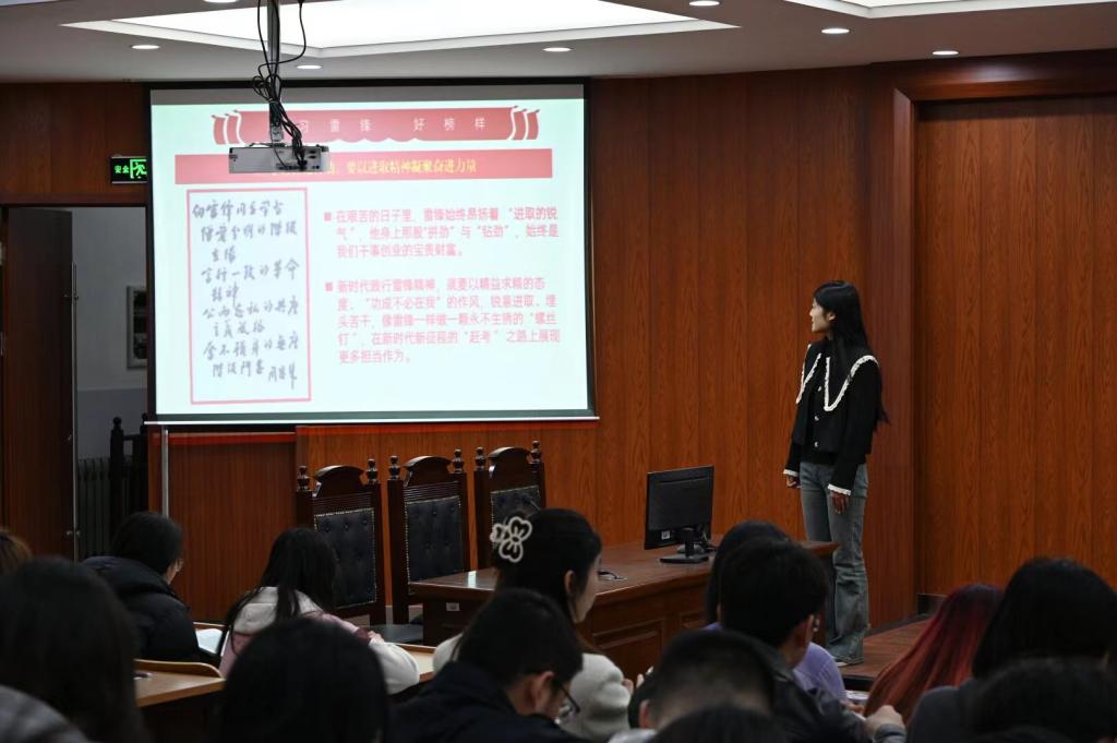 学院分团委组织委员、“青年·说”大学生理论宣讲团成员邱千纯为学员们带来题为“厚植雷锋精神 感应时代号召”的主题宣讲。她从读懂雷锋精神、弘扬雷锋精神、践行雷锋精神三方面进行讲述,指出雷锋精神是中华民族优秀文化的重要组成部分,是新时代不可或缺的精神支柱,学习雷锋精神的意义深远,既是个人成长的指引,也是社会和谐的基石。她激励同学们从身边最平凡的小事做起,把崇高理想信念和道德品质追求转化为具体行动,立足新时代,承担新使命。