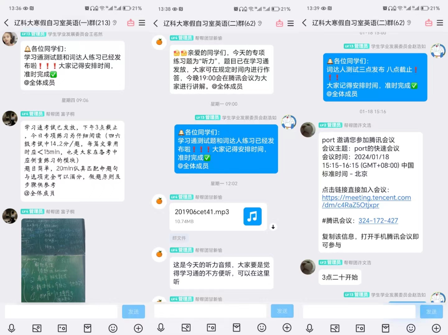 此次活动让一路坚持下来的同学们感触良多。金融科技2023-1班刘世涛:“作为一名大一学生,第一次参加寒假自习室活动,我在这次学习活动中,深刻感受到了知识的魅力。每一个知识点都像是打开新世界大门的钥匙,让我对这个世界充满了好奇和敬畏。同时,我也认识到了自己的不足,明白了还有很多需要学习和掌握的知识,在未来的学习和生活中,我会更加珍惜这样的机会,努力提升自己的能力,为未来的道路打下坚实的基础。”法学2022-2班包蓉:“一个人能走多远,看他与谁同行,一个人有多优秀,看他有什么人指点。在寒假期间加入线上自习室,不仅让我养成了良好的学习习惯,也激励了我不断地深入学习与成长。很开心能在大二就参加到这么好的活动中,拥有这么多宝贵的学习资源。我一定会好好利用这些资源,努力让自己汲取知识、不断成长。”财务2021-1班柴伟:“入学至今我已经参加了三届线上自习室活动。随着每天手机铃声的响起,我会快速进入学习通开始一天的自习室学习。在自习室中,我不仅学到了很多知识,还结识了诸多优秀的学长学姐,很多不懂的问题在学长学姐的指点下都迎刃而解。希望自习室活动能一直陪伴我们走下去,走过更多个寒来暑往。”