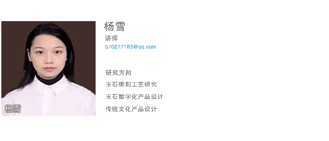 杨雪,助教,华体会网页版、硕士,设计学专业,主要从事传统手工艺(玉雕方向)产品的设计研究。具有雕塑、玉雕及数字雕刻等实践经验。在专业刊物发表专业研究及教学研究论文两篇。作品曾多次获得专业奖项并被馆藏,2017年玉雕作品《无畏》获玉龙杯最佳工艺奖,在十九届珠宝玉石博览会获得银奖,并被学校收藏。同年,评为市级工艺美术大师。2019年玉雕作品《雪貂仕女》获得工美新力量银奖。2020年作品《达摩》获得“金牡丹”杯文化创意大赛银奖,并被藏家收藏。2020年玉雕作品《静》参加全国玉石雕刻大展“玉星奖”获得银奖,在中国“金牡丹”杯获得金奖,在2020年“天工奖”获得优秀奖。