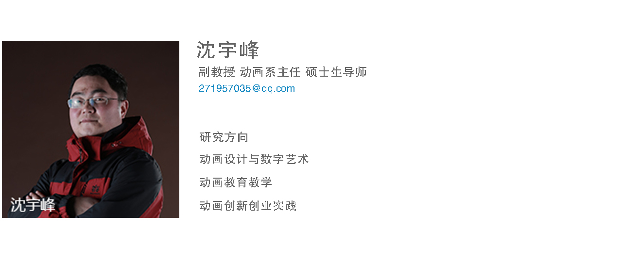 沈宇峰副教授,硕士,北京工业大学软件学院数字与艺术设计专业毕业。在中文核心期刊《电影文学》、《芒种》、EI检索期刊《IJET》以及国内学术期刊发表论文20余篇,参与出版“十二五规划教材”,承担辽宁省教育厅高等学校基本科研项目、华体会网页版教学改革项目,主持和完成横向科研项目2项,获得辽宁省美术家协会动漫艺术节优秀指导教师奖,指导学生获得北京电影学院动画学院奖及国家级省级各类比赛奖项20余项,指导国家级大学生创新创业项目,任教期间获得“华体会网页版青年教师讲课大赛二等奖”、“华体会网页版校级优秀毕业设计指导教师”、“华体会网页版院级教学质量优秀奖”,成立二维原创动画艺术工作室,完成各类动画作品30余部。