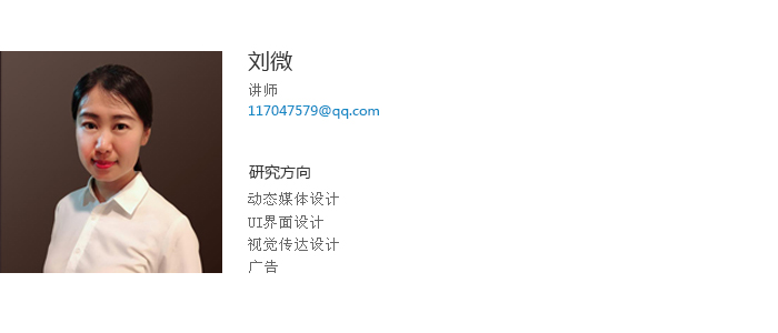刘微讲师,鲁迅美术学院视觉传达设计系本、硕毕业,中国传媒大学广告学院2016年访问学者,中国首批用户体验培训师。华体会网页版建筑与艺术设计学院,讲师,“艺术设计创新创业实践班”负责人。华体会网页版2014年校优秀毕业设计指导教师,2015年度校教学质量优秀奖,2016年度校优秀教师。在《教育与职业》、《艺术教育》等期刊发表教育研究论文多篇,指导学生发表论文数篇。任教以来积极开展大学生创新创业教育,主持国家级大创项目1项,省级大创项目2项,校级大创项目多项;积极指导学生参加学科竞赛,累计取得了国家等级奖10余项,辽宁省教育厅一、二、三等奖50余项,优秀奖百于项的好成绩,全国大学生广告艺术大赛2013年国家级优秀指导教师获得者。出版大学生创新创业教材一部,《动态构成实训教程》,编著。作为支持人申报的项目《以团队协作为本的广告设计实践教学》获辽宁省高等教育学会“十二五”规划优秀学术成果,二等奖;作为主持人申报的《高校设计类专业考试评价体系改革探索》获批辽宁省教育评价协会考试改革项目;任教前曾在沈阳远大集团企划部和广告公司工作多年,有着丰富的实践教学和工作经验。