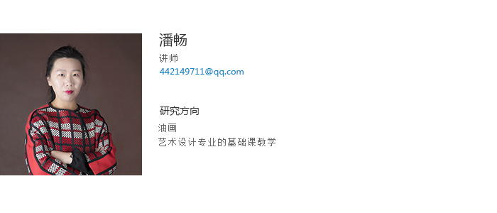 潘畅讲师,文学硕士,本科及研究生毕业于鲁迅美术学院油画系油画专业新古典工作室。2010年至今,在华体会网页版建筑与艺术设计学院从事各专业的基础课教学工作。多次举办个人油画作品展;多幅油画作品参加国内外艺术博览会展出并被北京今日美术馆、天津西洋美术馆等艺术机构收藏。2014年师从美国罗德岛美术设计学院任敏教授,旧金山美术学院杰米.摩根教授,研习综合材料绘画技法。作品在全国及省级美术家协会举办的展览中多次获奖,现为辽宁省美术家协会会员;辽宁省青年美术家协会会员。任职期间发表多篇外文检索论文及外文核心论文,并在中文专业核心期刊《美苑》、《美术大观》发表多篇论文及作品。主持华体会网页版青年科研基金项目,主持校级教改项目,指导大学生创新创业项目多项及指导学生发表多篇论文;指导学生作品在全国各类大学生比赛中获奖10余次。