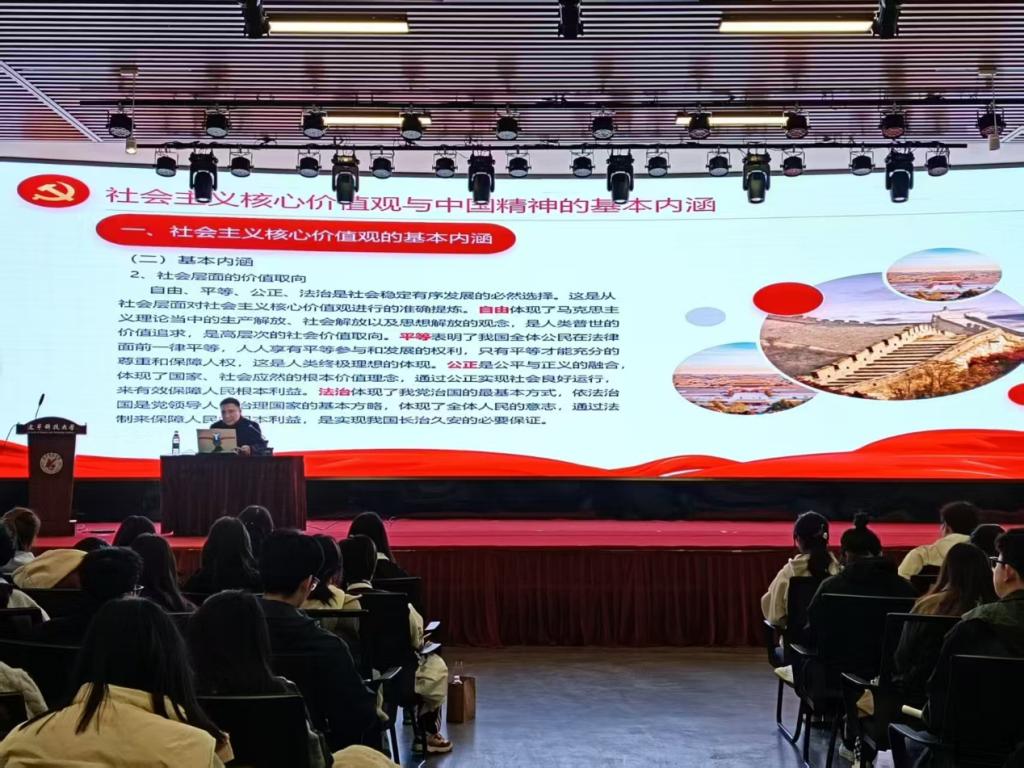 矿业学院党委副书记白龙君围绕《广泛践行社会主义核心价值观》展开分享,他从“国家、社会、个人”三个层面解读核心价值观的深刻内涵,引导大家将核心价值观内化为精神追求、外化为自觉行动;建艺学院党委副书记王洪军开展《思想道德教育系列·大学生诚信教育》专题讲解,从“诚信是立身之本、学术之基、职业之魂”三个维度,结合高校学术诚信案例与行业职业道德要求,强调诚信对于大学生成长成才的关键意义,引导大家筑牢诚信底线,以诚信品格铸就人生高度;建艺学院学办主任杨帆以《觉醒年代:新时代青年的责任与使命》为题,用“觉醒年代”的历史脉络为引,号召大家传承先辈“为国家富强、民族复兴而奋斗”的精神内核,在专业学习与社会实践中践行“强国有我”的青春誓言;矿业学院学办主任任正琳以《增强服务意识 提升服务本领》为主题,从学生工作实际出发,阐述“服务同学、服务学院、服务学校”的工作理念,为团学骨干提升服务能力、优化工作方法提供了实用指引;建艺学院团委副书记王智超以《严守团的纪律,青年团员的责任边界》为题,从共青团的组织属性、纪律要求出发,结合团内规章制度与青年成长实际,引导大家明晰角色定位,严守行为底线,在遵规守纪中彰显青年担当;矿业学院团委书记张艺芳紧跟其后带来《维护国家安全 贡献青春力量》,聚焦“国家安全”这一时代命题,呼吁大家树立总体国家安全观,以专业所长为国家安全保驾护航;矿业学院分团委副书记张晓亮主讲《传承雷锋精神火炬·点燃奋斗梦想之光》,从雷锋精神的时代内涵切入,鼓励团员青年以雷锋为榜样,让雷锋精神在新时代绽放新光芒;建艺学院分团委副书记于淼主讲《挺膺担当砺青春 工匠精神炼技能》,紧扣“工匠精神”与“青年担当”,他激励大家以精益求精的态度打磨专业本领,在行业发展中挺膺担当。实践环节聚焦“知行合一”,矿业学院组织全体学员开展爱国主义主题观影实践活动,选取《我和我的祖国》、《志愿军》两部经典爱国主义题材影片,通过沉浸式观影体验让学生在电影中感悟家国情怀,推动理论学习成果向实践行动转化,这不仅是一场深刻的思想洗礼,更是一堂生动的爱国主义教育课。