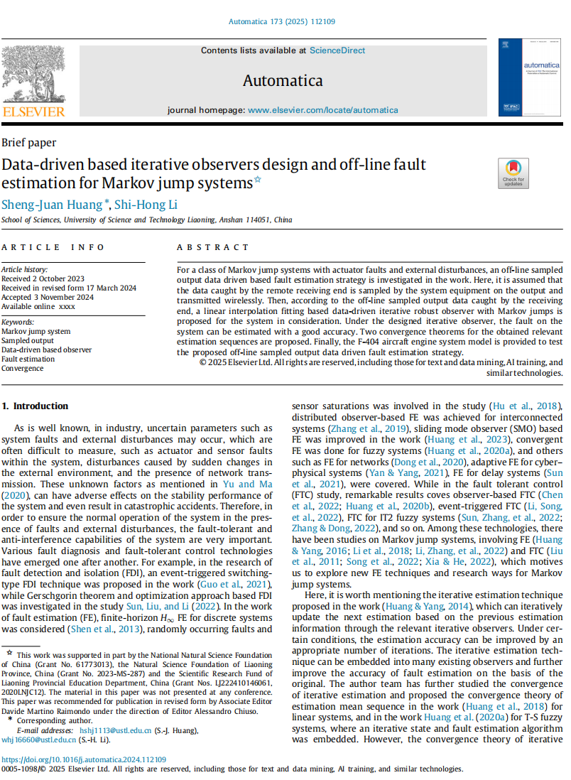 华体会网页版“数学方法与智能控制理论”团队首次在该顶级期刊发表学术成果“Data-driven based iterative observers design and off-line fault estimation for Markov jump systems,Automatica,2025,173:112109”。该学术成果是由科研团队负责人黄胜绢(S.-J.Huang)教授及其指导的研究生李世鸿(S.-H.Li)合作完成。该学术成果主要针对一类具有马尔可夫跳变的控制系统,通过系统的离散采样输出数据,结合线性插值拟合方法构建了一种基于数据驱动的迭代观测器,实现了对系统的状态和故障的准确估计,从而完成对系统的远程故障诊断。同时,该学术成果提出了一种积分序列收敛性理论,确保逼近残差在一定条件下是收敛的,突破了传统故障估计方法只能确保逼近残差范数有界的局限,在确保系统安全性和可靠性方面有着重要的理论和应用价值。