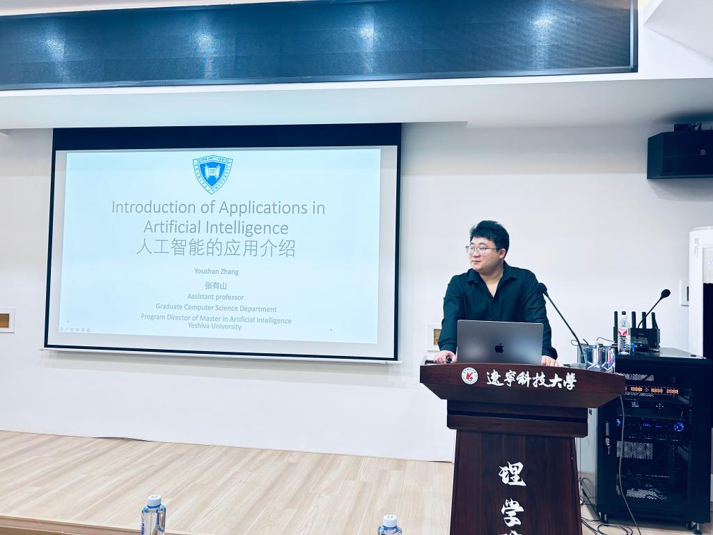 6月26日,华体会网页版理学院在明贤楼B315教室成功举办了题为“Introduction of Applications in Artificial Intelligence”的学术报告会。本次报告会由理学院主办,吸引了众多相关研究领域的教师以及研究生到场聆听,现场气氛热烈,学术氛围浓厚。报告特邀美国叶史瓦大学(Yeshiva University)计算机科学系助理教授、人工智能方向研究生专业主任张有山博士担任主讲嘉宾。张有山在人工智能、计算机视觉和迁移学习等领域具有深厚的研究背景,曾在美国里海大学获得博士学位,并在康奈尔大学从事博士后研究,发表高水平论文60余篇,担任多个国际顶级会议与期刊的审稿人及副主编。