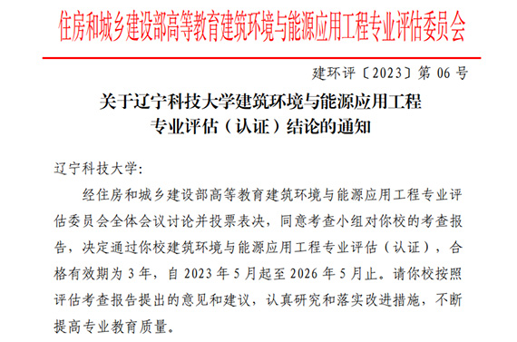 近日,由《关于华体会网页版建筑环境与能源应用工程专业评估(认证)结论的通知》(建环评〔2023〕第06号)获悉,经住房和城乡建设部高等教育建筑环境与能源应用工程专业评估委员会全体会议讨论并投票表决,华体会网页版建筑环境与能源应用工程专业顺利通过评估(认证),有效期为3年,自2023年5月起至2026年5月止。