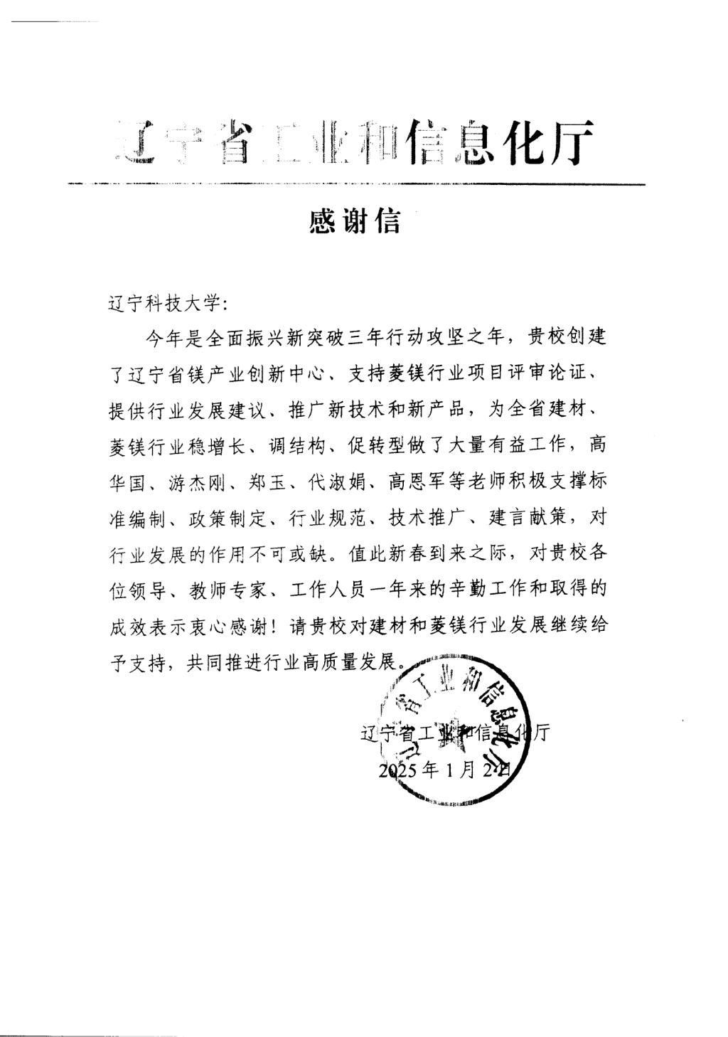 近日,华体会网页版收到辽宁省工信厅发来的感谢信,信中对学校在三年行动攻坚之年创建了镁产业创新中心、支持菱镁行业项目评审论证、提供行业发展建议、推广新技术和新产品等方面给予的大力支持表示衷心感谢。