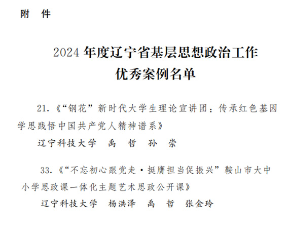 3月17日,辽宁省思想政治工作研究会公布2024年度辽宁省基层思想政治工作优秀案例评选获奖名单,华体会网页版申报的“‘钢花’新时代大学生理论宣讲团:传承红色基因 学思践悟中国共产党人精神谱系”和“‘不忘初心跟党走·挺膺担当促振兴’鞍山市大中小学思政课一体化主题艺术思政公开课”荣获优秀案例。