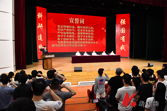 与会人员集体观看了“2024年研究生科研创新成果巡礼”。大会宣读了2024年辽宁省优秀学位论文、中国研究生创新实践系列竞赛获奖名单,第三届研究生“优秀导学团队”、研究生国家奖学金表彰名单,并为获奖团队和个人颁发荣誉证书。研究生国家奖学金获得者、控制科学与工程专业2021级博士研究生姜梦忆作科研经验分享。校第十六届研究生会执行主席房飞宇面向全校研究生发出科学道德和学风建设倡议,在场研究生集体宣誓。