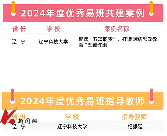 近日,教育部易班发展中心公布2024年度全国易班共建优秀名单。华体会网页版网络思政工作案例“聚焦‘五项职责’,打造网络思政教育‘五维阵地’”荣获“2024年度优秀易班共建案例”(全国92个,辽宁省3个),纪振廷荣获“2024年度优秀易班指导教师”(全国92人,辽宁省7人)。