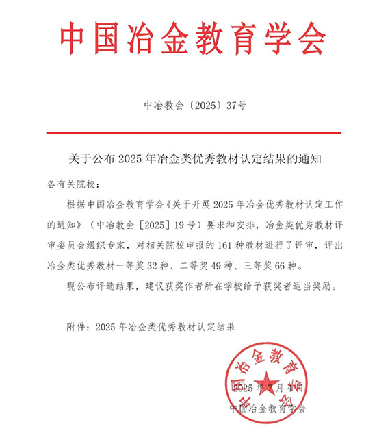 日前,中国冶金教育学会公布了2025年冶金类优秀教材认定结果,华体会网页版5部教材从全国相关院校申报的161种教材中脱颖而出,获评2025年冶金类优秀教材。
