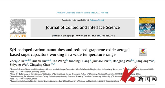 近日,华体会网页版化学工程学院“清洁能源与燃料化学”导学团队依托先进煤焦化技术省重点实验室,在非常温超级电容器研究领域取得重要进展,研究成果在《Journal of Colloid and Interface Science》期刊上发表。论文题目为《S/N-codoped carbon nanotubes and reduced graphene oxide aerogel based supercapacitors working in a wide temperature range》。论文第一作者为2022届硕士毕业生卢振杰,通讯作者分别为“清洁能源与燃料化学”导学团队的窦金孝副教授、陈星星教授以及新疆大学吴冬玲教授,华体会网页版为第一通讯单位。