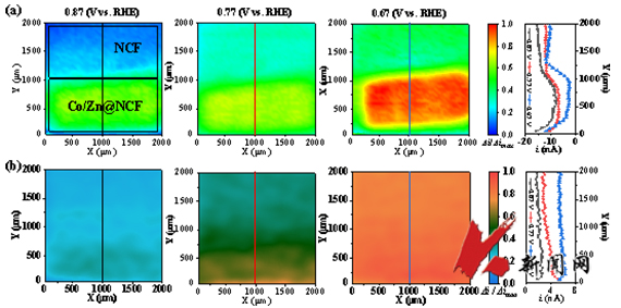 可再充电锌空气电池因其高能量密度、安全性、稳定性和低成本而越来越受到关注。实现高性能锌空气电池需要设计一种具有优异活性和耐用性的双功能氧反应电极。静电纺丝技术作为一种简单的策略被广泛应用于制备无粘合剂膜电极,所制备的膜电极通常具有优异的柔韧性、机械强度、可调的电催化位点。随着先进的自支撑膜电极材料的发展,在不损伤电极结构的前提下更准确地揭示膜电极材料的微区反应性能,对原位电化学表征技术的要求越来越高。扫描电化学显微镜作为一种重要的原位电化学分析工具,可在亚微米或纳米尺度下高时空分辨率地评估催化材料的微区电化学活性。该研究工作报道了一种自支撑的N掺杂Co/Zn碳纳米纤维膜(Co/Zn@NCF)具有卓越的氧反应催化活性和耐久性。基于Co/Zn@NCF的液态ZABs表现出超过666小时的充放电循环寿命,充/放电电压差为0.64V、电压效率为66%。基于Co/Zn@NCF构筑的柔性固态锌空气电池能够在不同的弯曲角度下实现稳定地充电和放电。