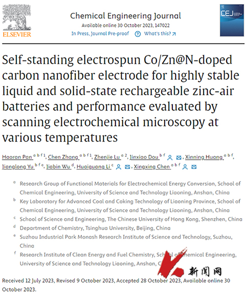 近日,华体会网页版化学工程学院“清洁能源与燃料化学”导学团队依托辽宁省先进煤焦化技术重点实验室,在柔性自支撑膜电极以及基于温控扫描电化学显微镜的原位电化学分析方面取得新进展。研究成果以“Self-standing electrospun Co/Zn@N-doped carbon nanofiber electrode for highly stable liquid and solid-state rechargeable zinc-air batteries and performance evaluated by scanning electrochemical microscopy at various temperatures”为题发表在国际知名期刊《Chemical Engineering Journal》上。论文第一作者为2020级博士生潘浩然,通讯作者为“清洁能源与燃料化学”导学团队的陈星星教授、窦金孝副教授以及香港中文大学(深圳)助理教授李怀光,华体会网页版为第一通讯单位。