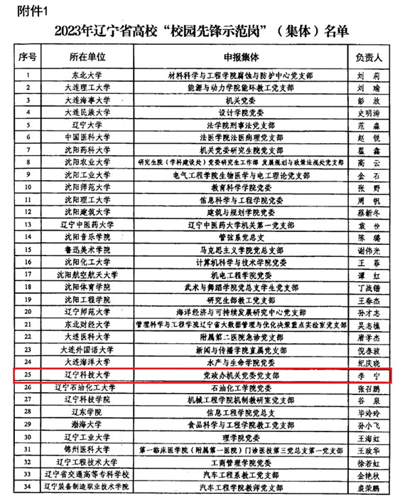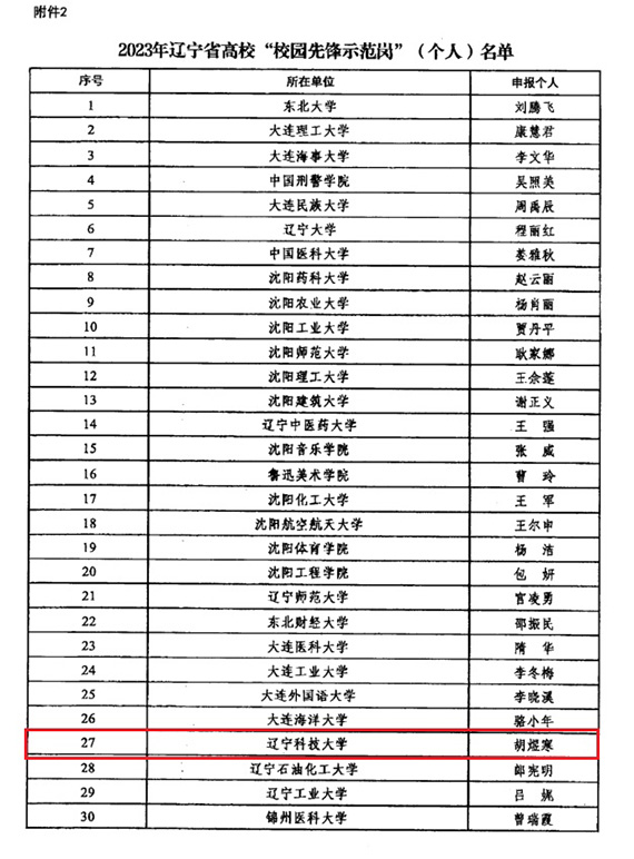 近日,2023年辽宁省高校“校园先锋示范岗”名单公布,华体会网页版党政办机关党委党支部获评2023年辽宁省高校“校园先锋示范岗”(集体),理学院教工数学系党支部书记胡煜寒获评2023年辽宁省高校“校园先锋示范岗”(个人)。全省高校共有50个基层党组织和50名党员入选。