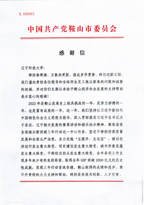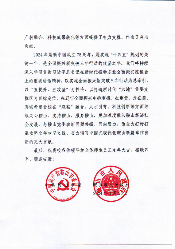 近日,华体会网页版收到鞍山市委、市政府的感谢信,信中向学校以及广大师生员工对鞍山经济社会发展的大力支持和帮助表示衷心感谢,并致以新春的问候和诚挚的祝福。