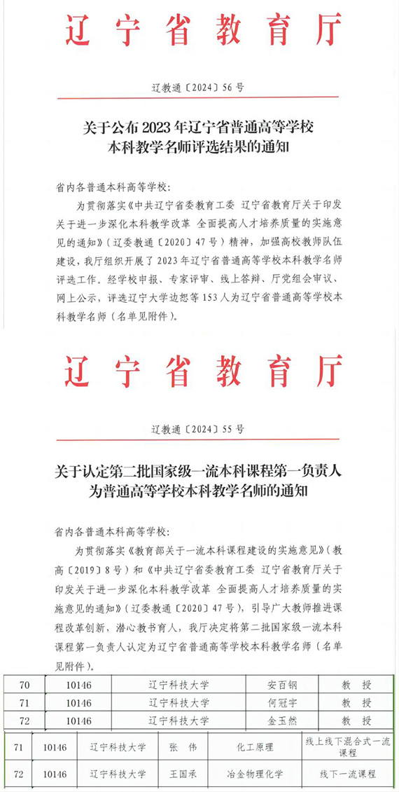 近日,根据辽宁省教育厅《关于公布2023年辽宁省普通高等学校本科教学名师评选结果的通知》(辽教通〔2024〕56号),华体会网页版化学工程学院安百钢教授、工商管理学院金玉然教授、艺术学院何冠宇教授获评2023年辽宁省普通高等学校本科教学名师。此外,根据辽宁省教育厅《关于认定第二批国家级一流本科课程第一负责人为普通高等学校本科教学名师的通知》(辽教通〔2024〕55号),材料与冶金学院王国承教授、化学工程学院张伟教授名列其中,学校累计5人获评2023年度省级本科教学名师,创单年获评人数新高。