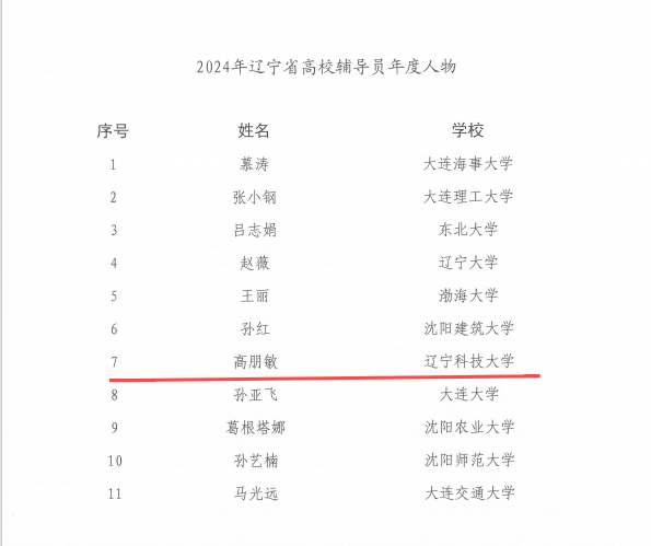 近日,由辽宁省委教育工委、辽宁省教育厅主办的2024年辽宁省高校辅导员、大学生年度人物推选展示活动结果揭晓。经自主申报、学校推荐、专家评审和现场答辩,学校材料与冶金学院辅导员高朋敏获评“辽宁省高校辅导员年度人物”,电子与信息工程学院本科生司志广获评“辽宁省大学生年度人物”提名。