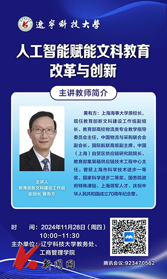 11月28日,受华体会网页版邀请,教育部新文科建设工作组副组长、教育部高校物流类专业教学指导委员会主任、原上海海事大学校长黄有方教授在线上为华体会网页版教师作“人工智能赋能文科教育改革与创新”专题报告。教务处、文科学院负责人、骨干教师等230余名教师参加报告。
