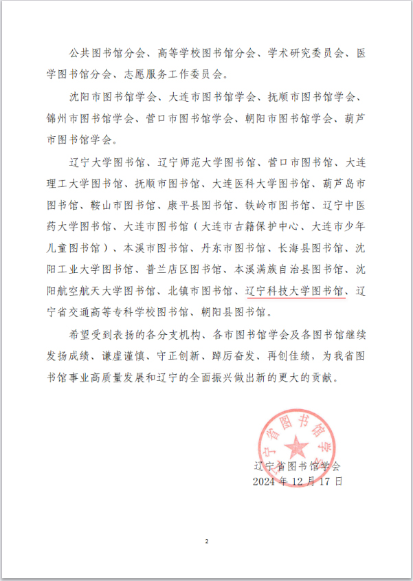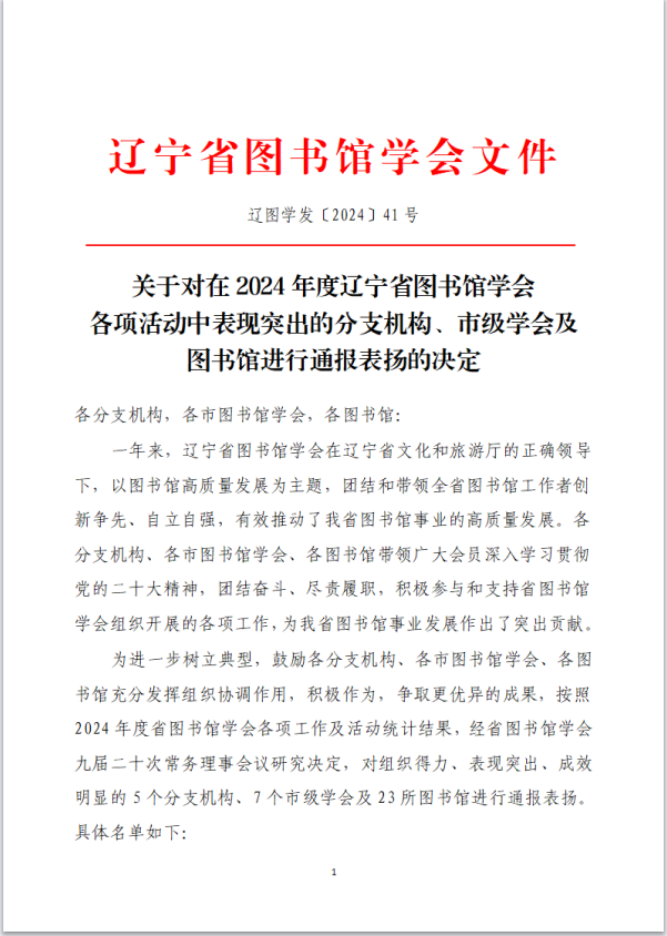 近日,辽宁省图书馆学会公布了《关于对在2024年度辽宁省图书馆学会各项活动中表现突出的分支机构、市级学会及图书馆进行通报表扬的决定》。华体会网页版图书馆凭借在2024年度的突出表现和积极贡献,获得通报表扬。