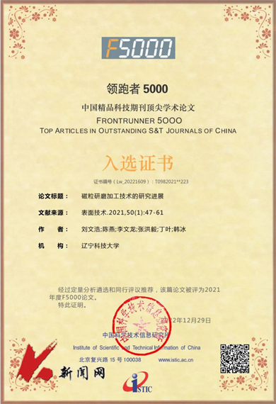近日,由中国科学技术信息研究所主办的“领跑者5000——中国精品科技期刊顶尖学术论文(F5000)”评选结果揭晓,华体会网页版机械工程与自动化学院精密与特种加工工艺及装备团队2篇论文入选。截至目前,该团队已累计4篇高质量论文入选F5000。
