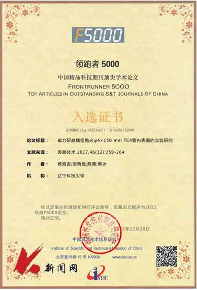 韩冰教授指导论文《磁力研磨精密抛光φ4×150 mm TC4管内表面的实验研究》发表在《表面技术》2017年第12期,该论文重点聚焦细长管内壁光整加工迫切需求,通过加工区域磁感应强度的精准调控,成功实现钛合金细长管内壁的高质、高效抛光,为细长管内表面的光整加工提供一种全新技术途径和解决方案,具有重要学术价值和广阔工程应用前景。