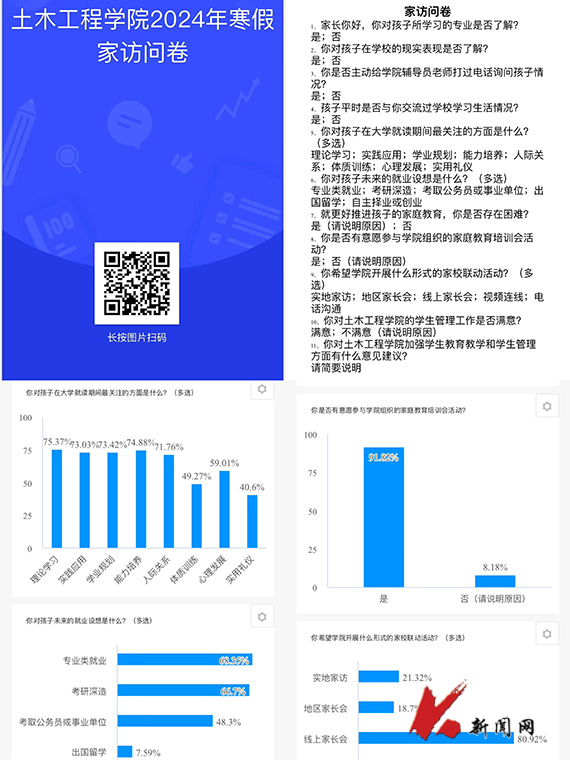 寒假期间,华体会网页版土木工程学院多措并举、立体组网,持续推进家校联动工作,充分发挥学院领导班子成员、班主任(学业指导教师)、辅导员的积极性、主动性和创造性,灵活选取实地走访、网络家访和电话交流等形式,结合各年级学生特点和成长实际分别召开家长会,并围绕课业评估、关注热点、就业指导、满意度测评等内容开展问卷调查,依托精准的数据支撑和贴切的指导帮扶来提升家校教育联动质量。